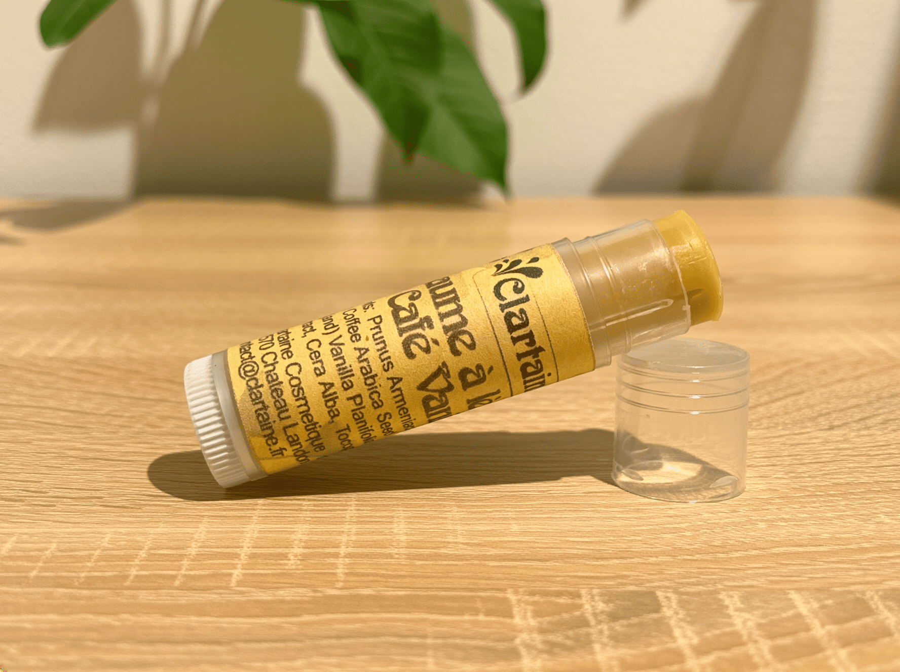 Ingrédients : Huile de noyaux de prune*, Cire d’abeille, Beurre de cacao*, Vitamine E, Mica Dorée.