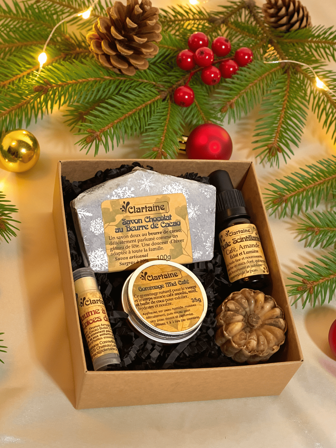 Le coffret Découverte de Noël est une invitation à entrer dans la magie des fêtes grâce à trois soins artisanaux en édition limitée. Parfums chocolatés, notes d’épices et éclat doré se mêlent pour offrir une première immersion douce, sensorielle et chaleureuse dans l’univers de Noël.